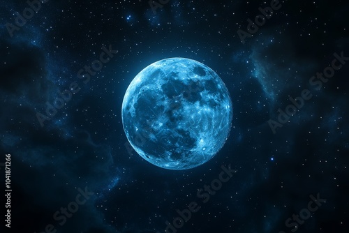 A blue moon glowing in the dark sky, surrounded by twinkling stars, creating a cinematic and epic atmosphere.