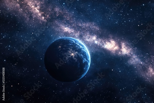 A blue planet is situated at the center of a galaxy, offering a stunning visual representation of celestial bodies