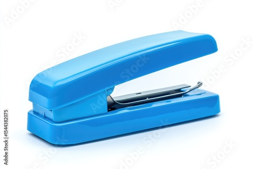 A blue plastic desk stapler, STEP-40B model, on a simple white background, with professional studio lighting and a top-down angle, capturing the isolated office supply in sharp focus.