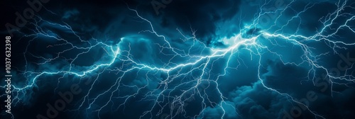A blue sky with a storm in the background. The sky is filled with lightning bolts. The sky is dark and cloudy