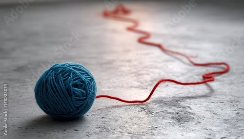 A blue yarn ball with a red thread on concrete. Used in textile art, storytelling visuals, or metaphors for life’s journey. It symbolizes creativity, interconnectedness, and unraveling possibilities.