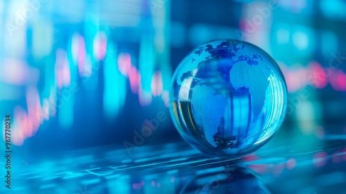 A blue-toned glass globe on a stock market graph background with copy space.