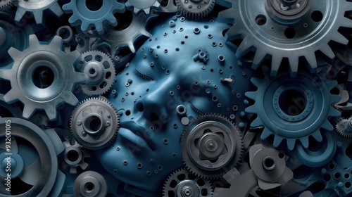 A blue-toned human face blends seamlessly into a backdrop of various gears, expressing the connection between humanity and technology in a thought-provoking manner