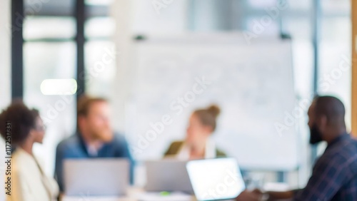 A blurred background depicting professionals engaging in discussions about business innovation and future technologies.