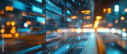 A blurred cityscape at night with illuminated lights and abstract patterns.