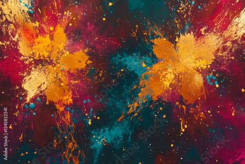 A bold, colorful abstract background featuring cosmic supernova bursts. The radiant explosions of deep crimson, glowing gold, and electric blue create a high-energy, space-inspired, and visually