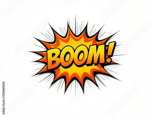 A bold comic-style explosion with the word "BOOM!" in dynamic yellow-orange text. Sharp black outlines and energetic bursts create a powerful impact effect.