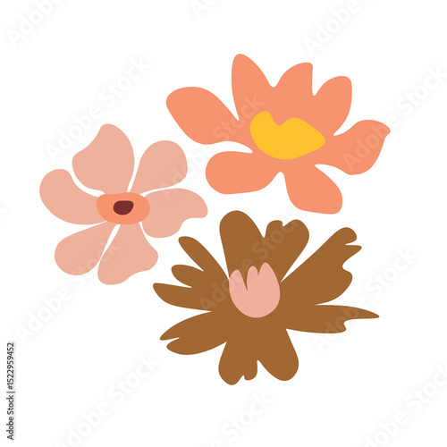A bold decorative composition of peach and mustard abstract flowers with scattered petals on a soft background.