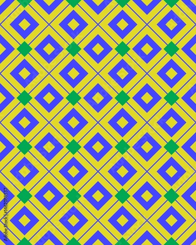 A bold geometric design displays diamonds and squares in bright yellow, blue, and green colors, creating a striking visual effect