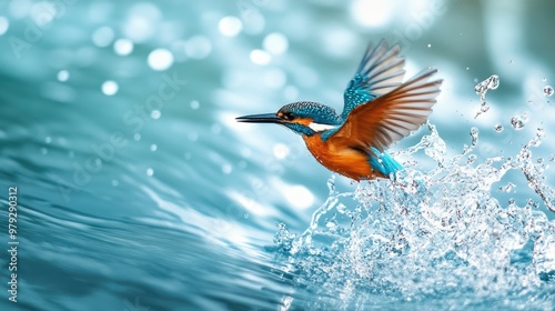 A bold orange and black kingfisher bird diving into a bright blue river, captured in perfect flight with the waters splash in the background