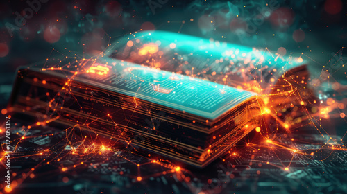 A book with a blue cover and orange text is lit up with bright lights. The book appears to be a dictionary or a book of some sort with a lot of information