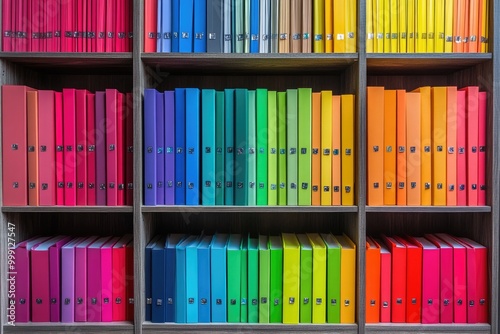 A bookshelf filled with colorful binders. This image represents organization, knowledge, and the vastness of information.