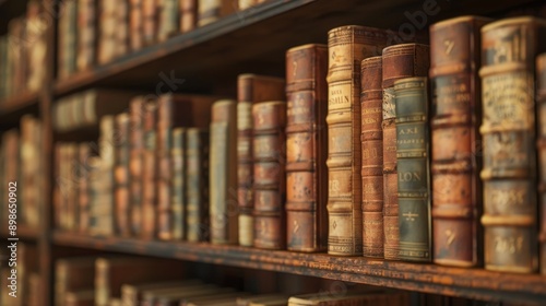 A bookshelf filled with rows of antique leather-bound books. The warm tones and textures create a sense of history and knowledge.