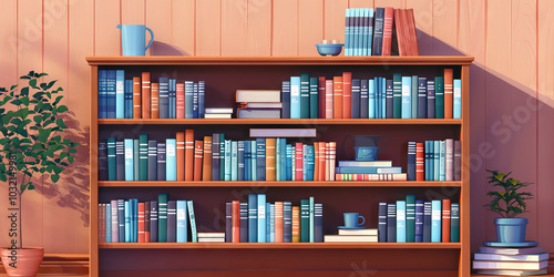 A bookshelf filled with self-help and mental health books, offering guidance and support in shades of warm brown and soft blue.