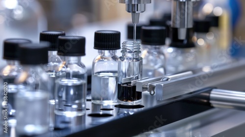 A bottle of liquid is being filled into a bottle with a black cap. Generate AI image