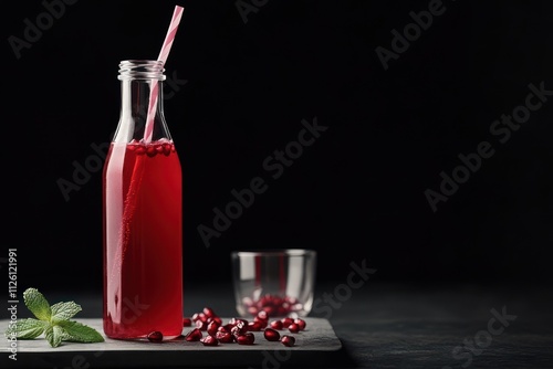 A bottle of red juice with pomegranate seeds and a mint leaf, set against a dark background.