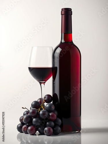A bottle of red wine with a few grapes on the side and a wine glass leaning against it, fine dining setup, red wine, evening table setting
