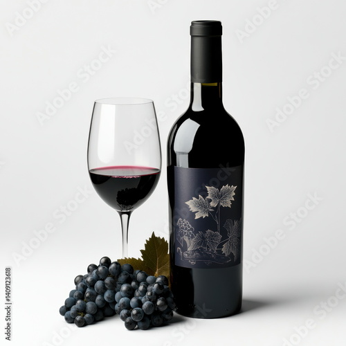 A bottle of red wine with grapes and leaves next to it