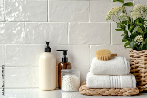 A bottle of soap is placed next to a neatly stacked pile of folded towels.