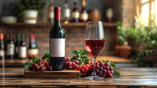 A bottle of unlabeled red wine on kitchen counter with a glass