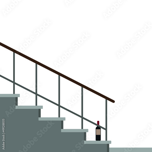 A bottle of wine stands on the bottom step of the stairs on a white background