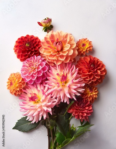 A bouquet of red, pink, and orange dahlia flowers isolated on a white background, featuring an overhead view of the flower heads with a matte effect.