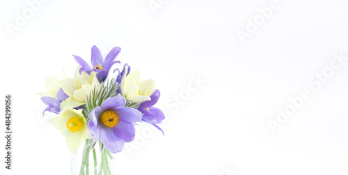 A bouquet of spring flowers, snowdrop or lumbago on light background. Copy space horizontal frame