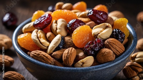 A bowl filled with a mix of nuts and dried fruits, ideal for healthy snacking.
