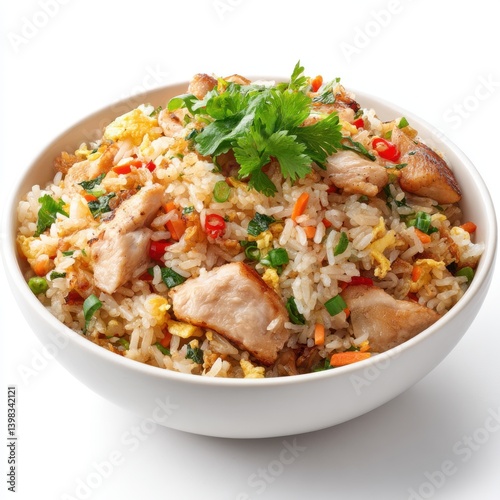 A bowl filled with chicken fried rice and cilantro garnish isolated on white background