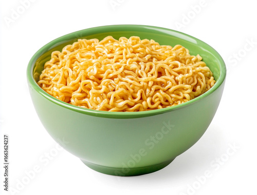 A bowl holds a pile of golden instant noodles, showcasing their curly, wavy texture against a clean white background.