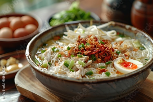 A bowl of chicken noodle soup with a soft-boiled egg, green onions, bean sprouts, and fried onions.