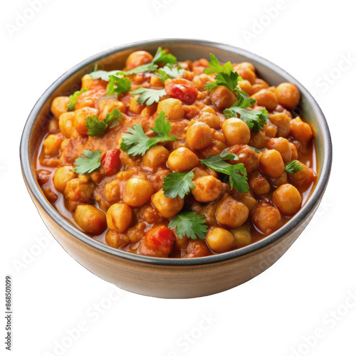 A bowl of chickpeas with herbs and vegetables on top on transparent background