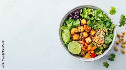 A bowl of colorful vegetarian Pad Thai, packed with vegetables and tofu, garnished with lime and peanuts, on a white background with copy space