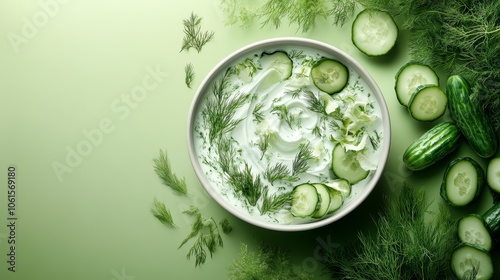 A bowl of creamy yogurt dip with fresh cucumbers and dill on a green background.