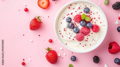 A bowl of creamy yogurt topped with fresh berries and mint on a pink background.