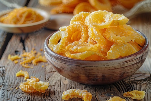 A bowl of crispy, golden onion rings, some scattered around the bowl, on a rustic wooden surface.