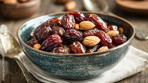 A bowl of dried dates, almonds, and dried cranberries, styled with antique silverware and a rustic wooden table