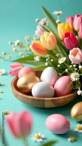 A bowl of eggs and flowers on a blue background. The bowl is wooden and has a gold and white egg in it.