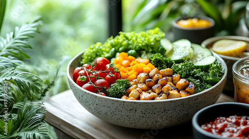 A bowl of fresh salad with grilled tofu, cherry tomatoes, cucumber, kale and broccoli.