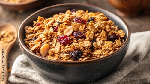 A bowl of granola with nuts and dried fruits, ideal for a healthy breakfast or snack.