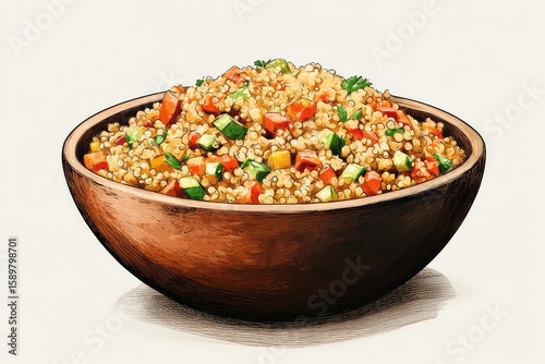 A bowl of quinoa mixed with diced vegetables and herbs, isolated on a white background