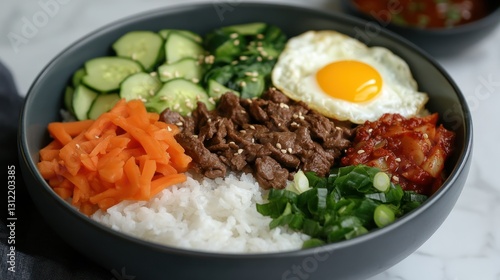 A bowl of rice with various toppings and a fried egg