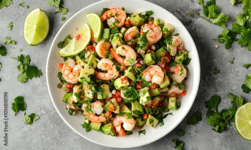 A bowl of shrimp and avocado salad with lime wedges on the side