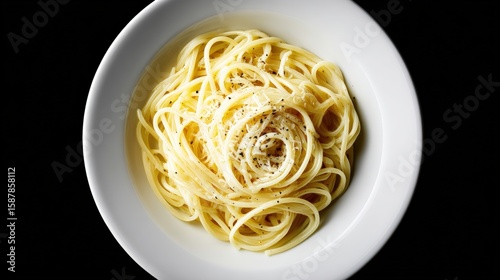 A bowl of spaghetti with grated cheese and pepper on a black background, showcasing a simple yet elegant pasta dish.