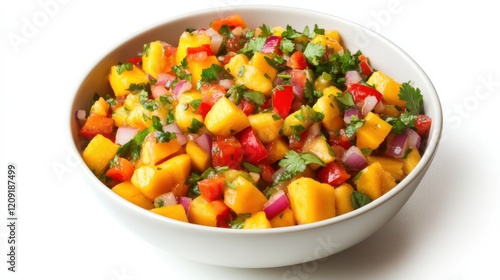 A bowl of tangy mango salsa with diced mango, red bell pepper, red onion
