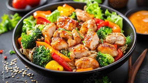 A bowl of teriyaki chicken with noodles, broccoli, red and yellow peppers, and a drizzle of sesame seeds.