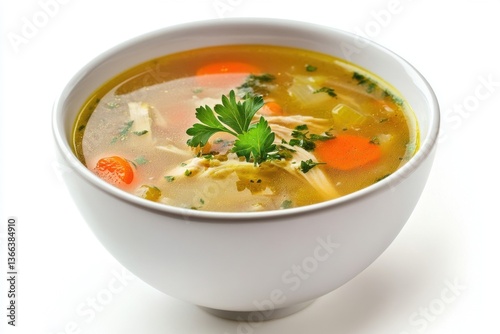 A bowl of warm chicken soup, isolated on white background.