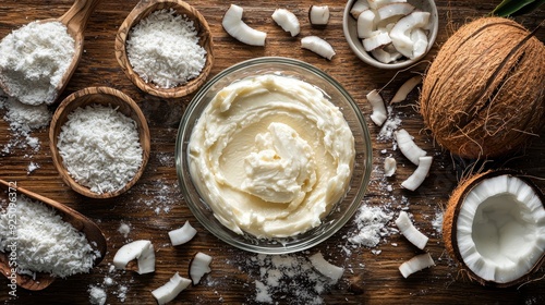 A bowl of white cream sits on a wooden table with a pile of shredded coconut
