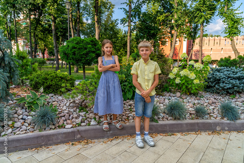 A boy and a girl pause on a pathway in a green park, with the girl smiling and boy adopting a more serious stance, trees and a red brick wall in the background