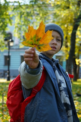 A boy in a blue jacket holds a yellow maple leaf in his hand
